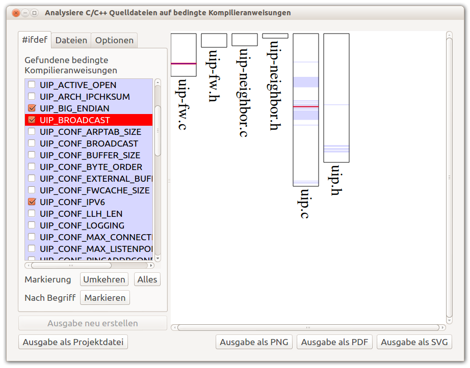 This software will give you a quantitative graphical overview of all used conditional comments, their spreading and a first understanding of how much code is affected by each one of the #if/#ifdef uses. The input is your codebase. Options for an output are vector based image types like svg and pdf, but also the raster based image type png.